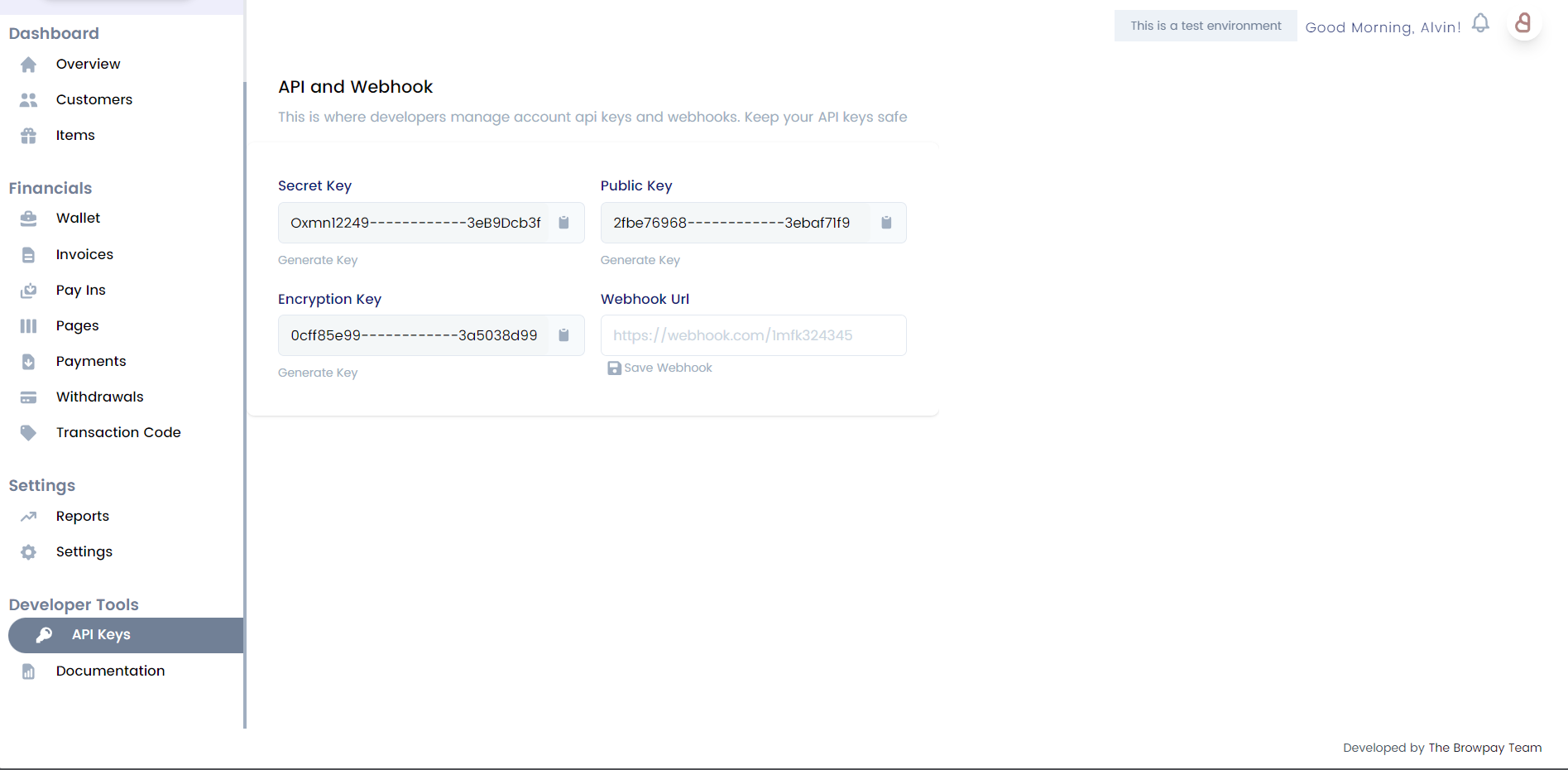 <figure><img src="https://3447090286-files.gitbook.io/~/files/v0/b/gitbook-x-prod.appspot.com/o/spaces%2FyBd6Cxdk3zaYhL3xhS5a%2Fuploads%2FgfyFYMzmKXwAUS3boEIH%2Fimage.png?alt=media&#x26;token=68600383-5161-40a5-bf26-0586773cf906" alt=""><figcaption><p>Browpay API Keys page</p></figcaption></figure>
